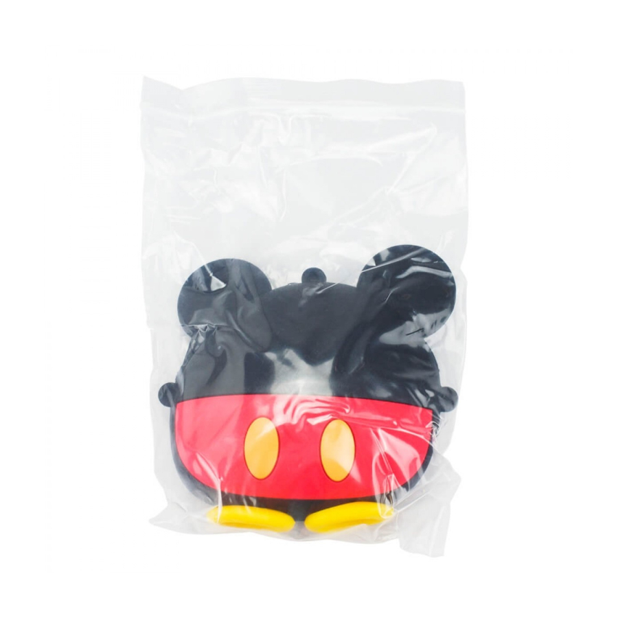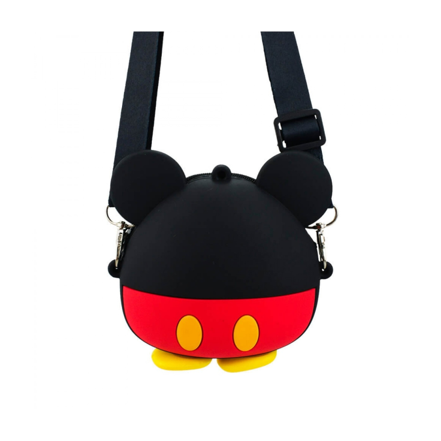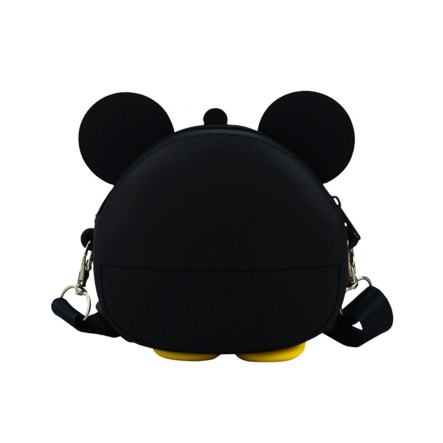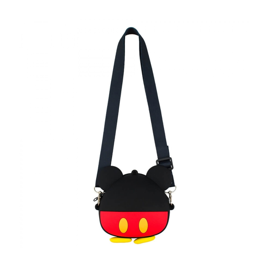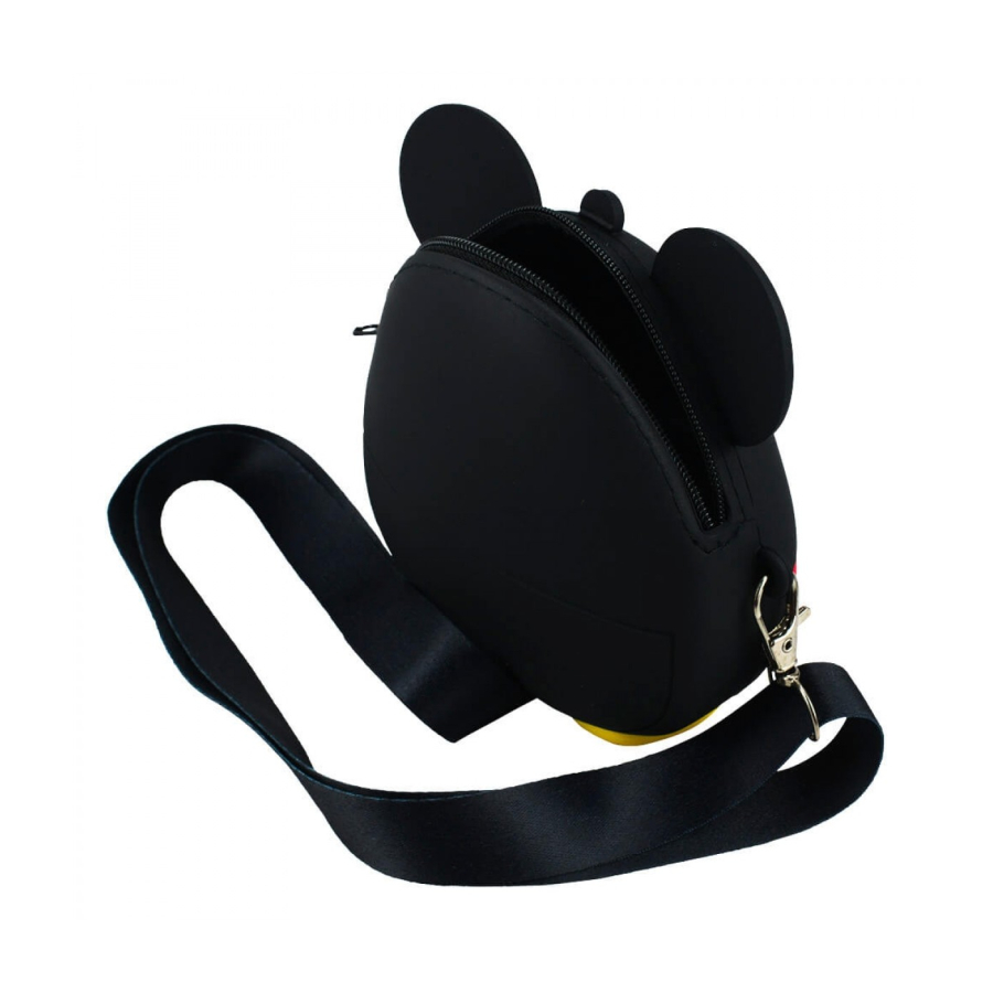 Bolsinha toda em silicone com 13 x 7 x 13 cm de dimensão. É no formato e com características do Mickey. Ao colocar na mesa ela parece estar de pé. Alça removível e ajustável. Um compartimento com fechamento a zíper. Material: silicone