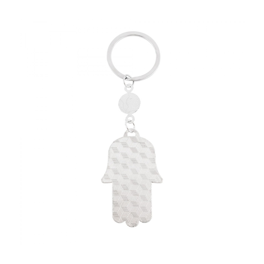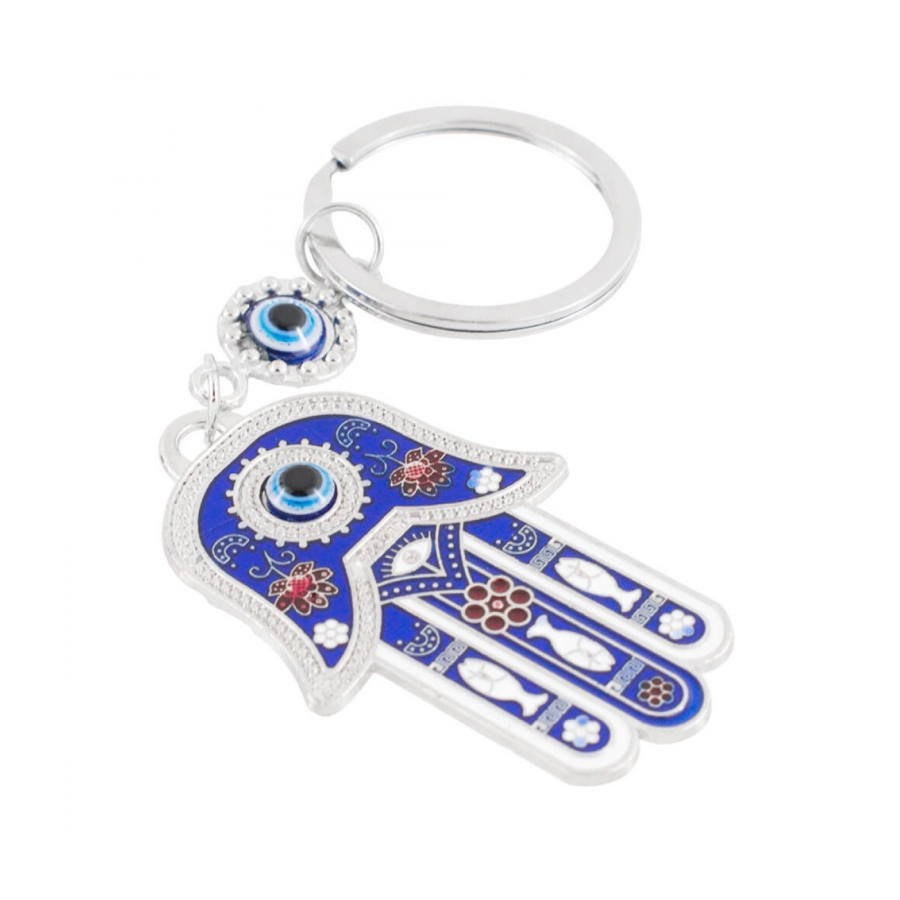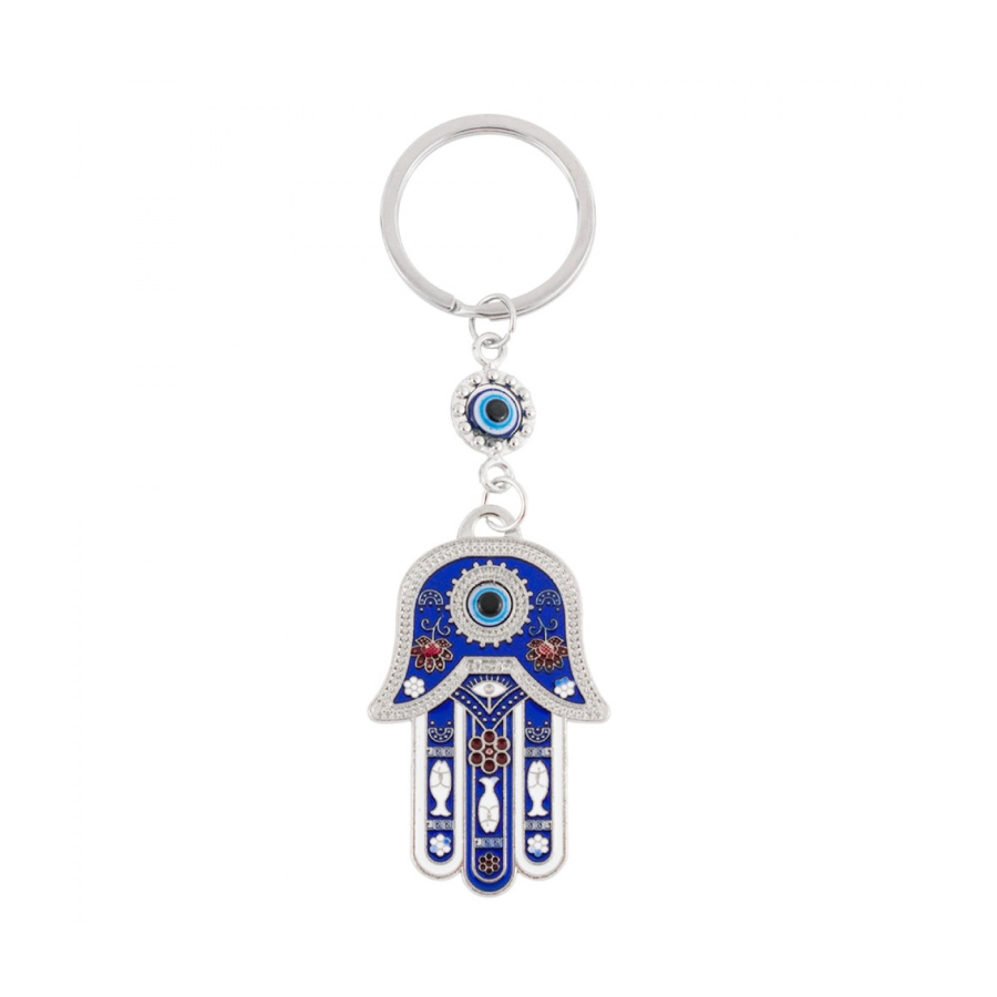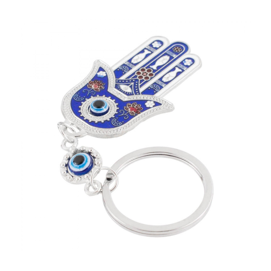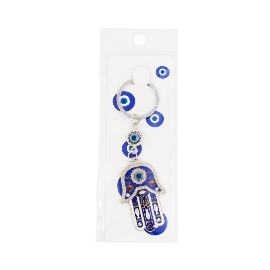 Chaveiro de metal Com Enfeite no formato de uma mão. Com 5,5 cm de altura , enfeitado com um Olho Grego Azul. Material: Metal
