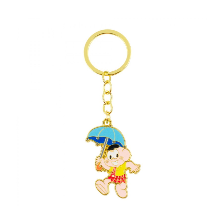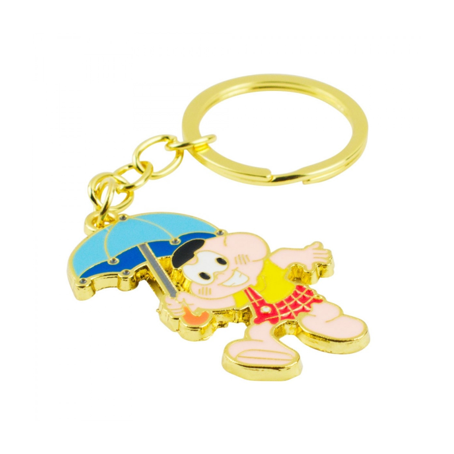 Chaveiro de argola e corrente dourada com enfeite no formato do Cascão de 5 cm de altura. Material: metal