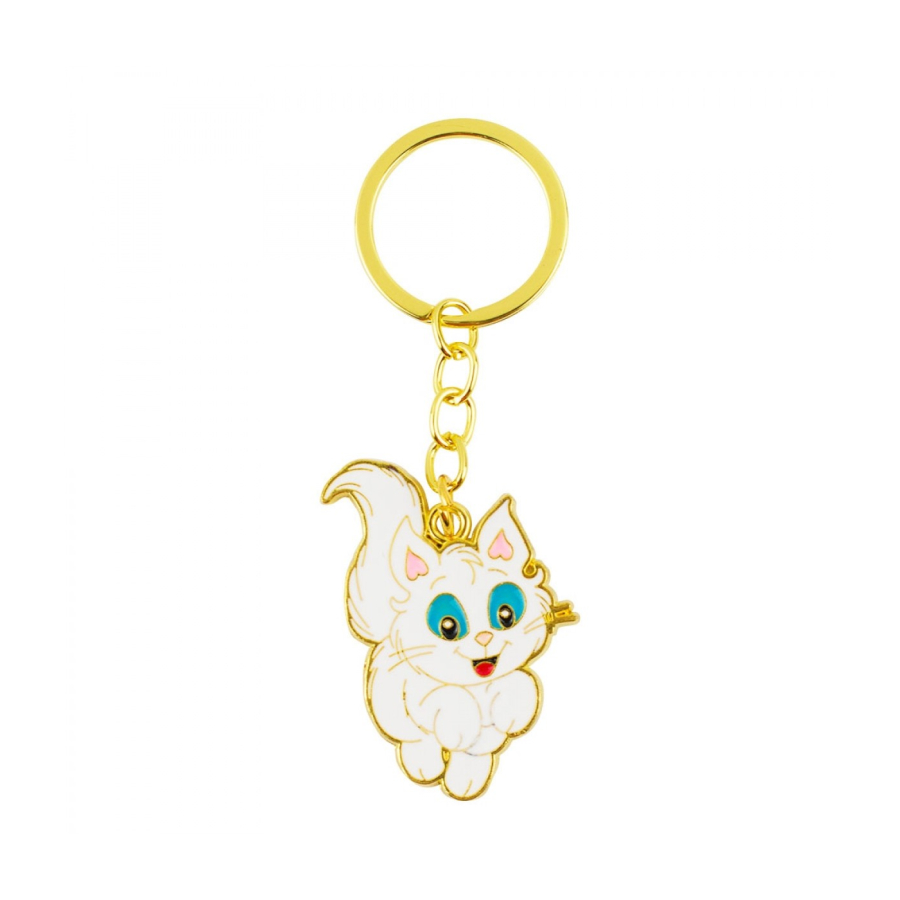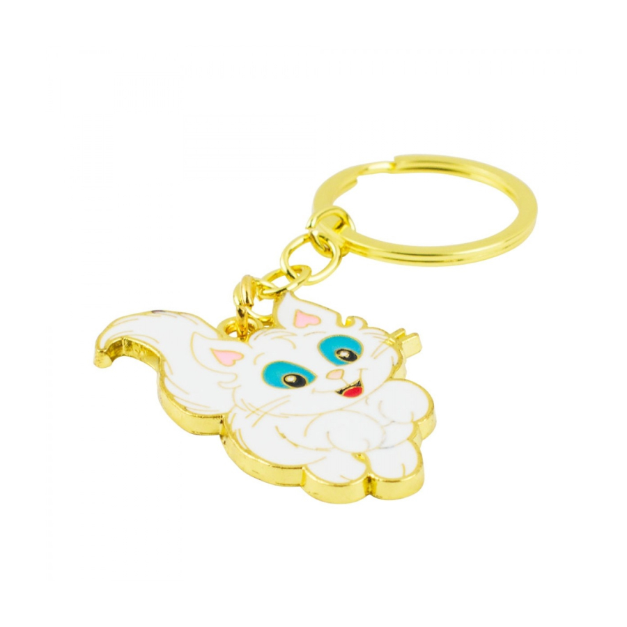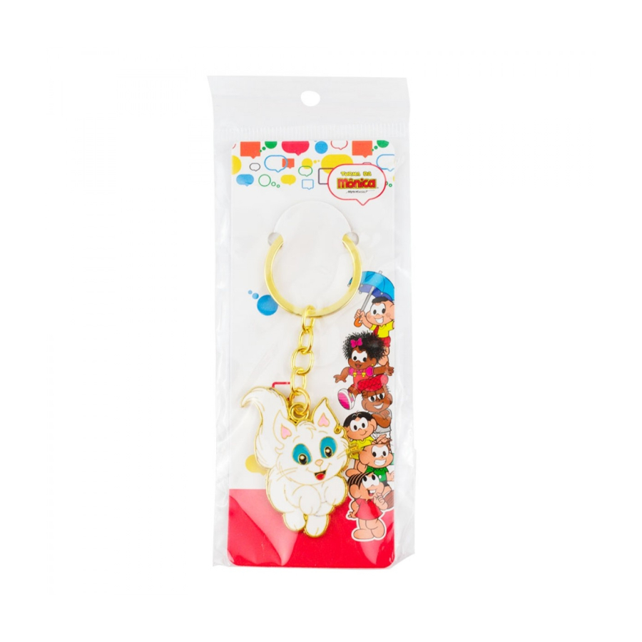Chaveiro de argola e corrente dourada com enfeite no formato do gato Mingau de 5 cm de altura. Material: metal
