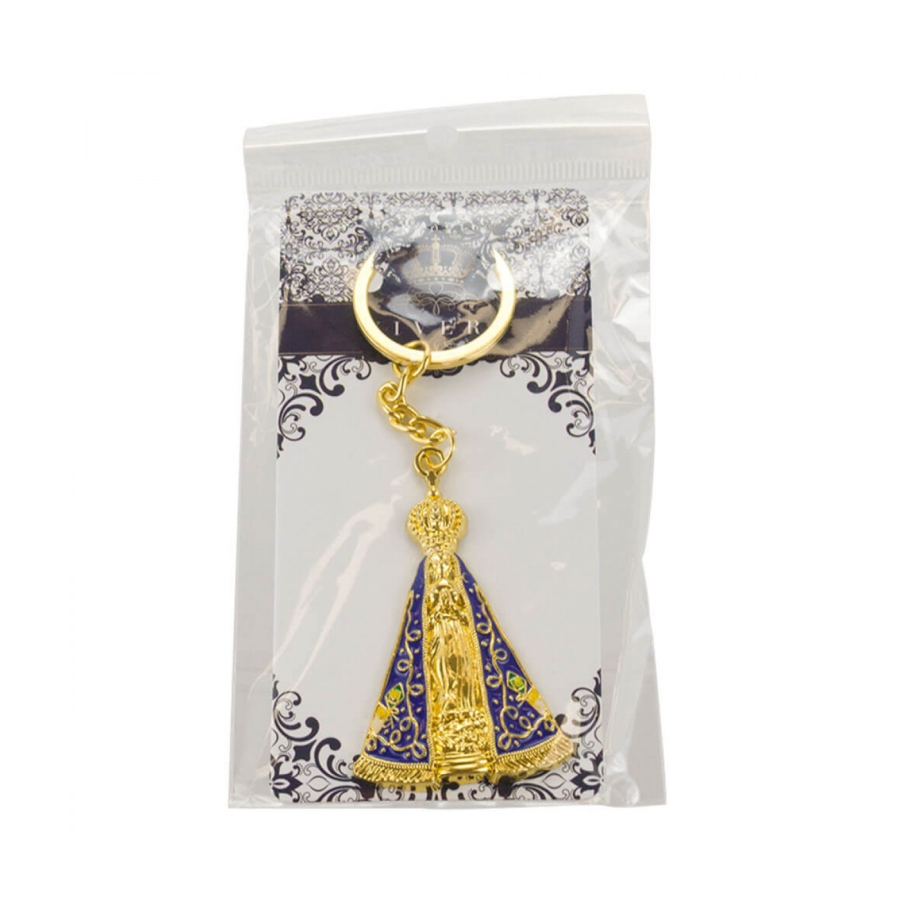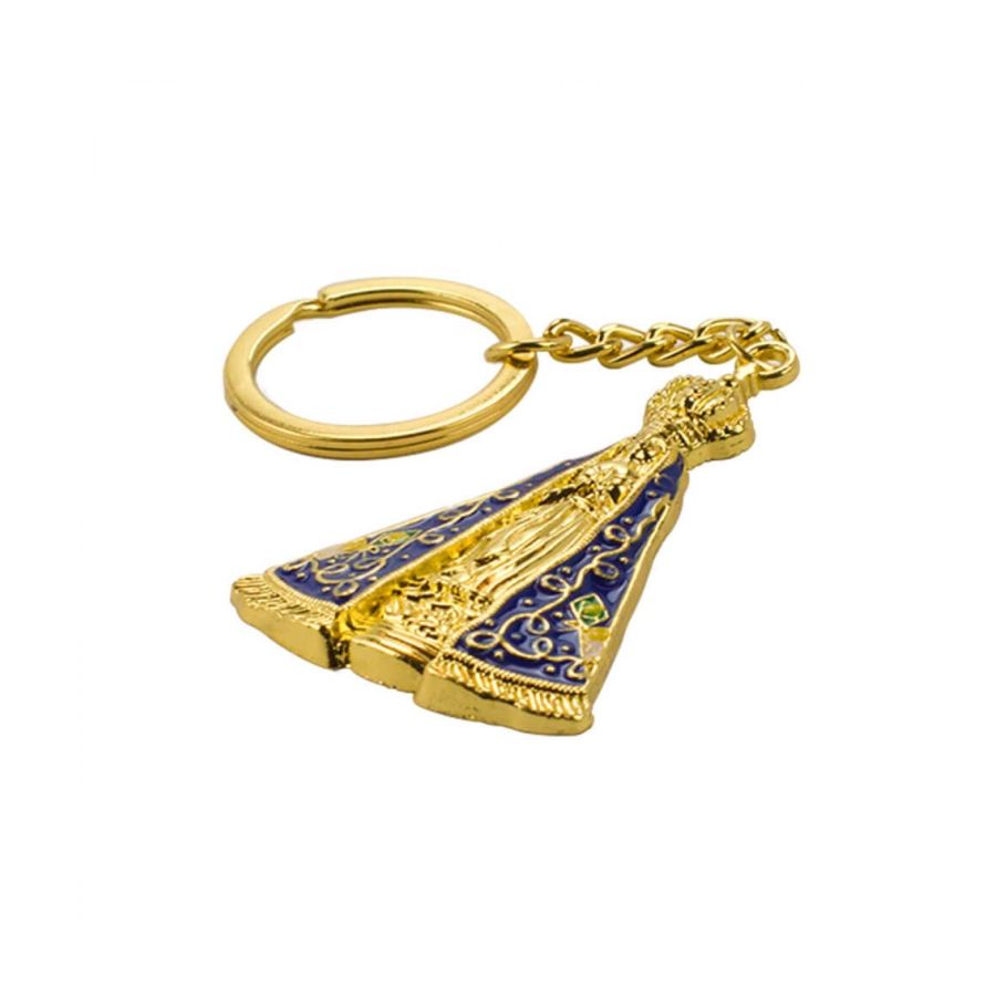 Chaveiro com enfeite em forma de Nossa Senhora Aparecida dourada de 5.5 cm de altura (sem corrente), cores fortes e realista. Material: metal