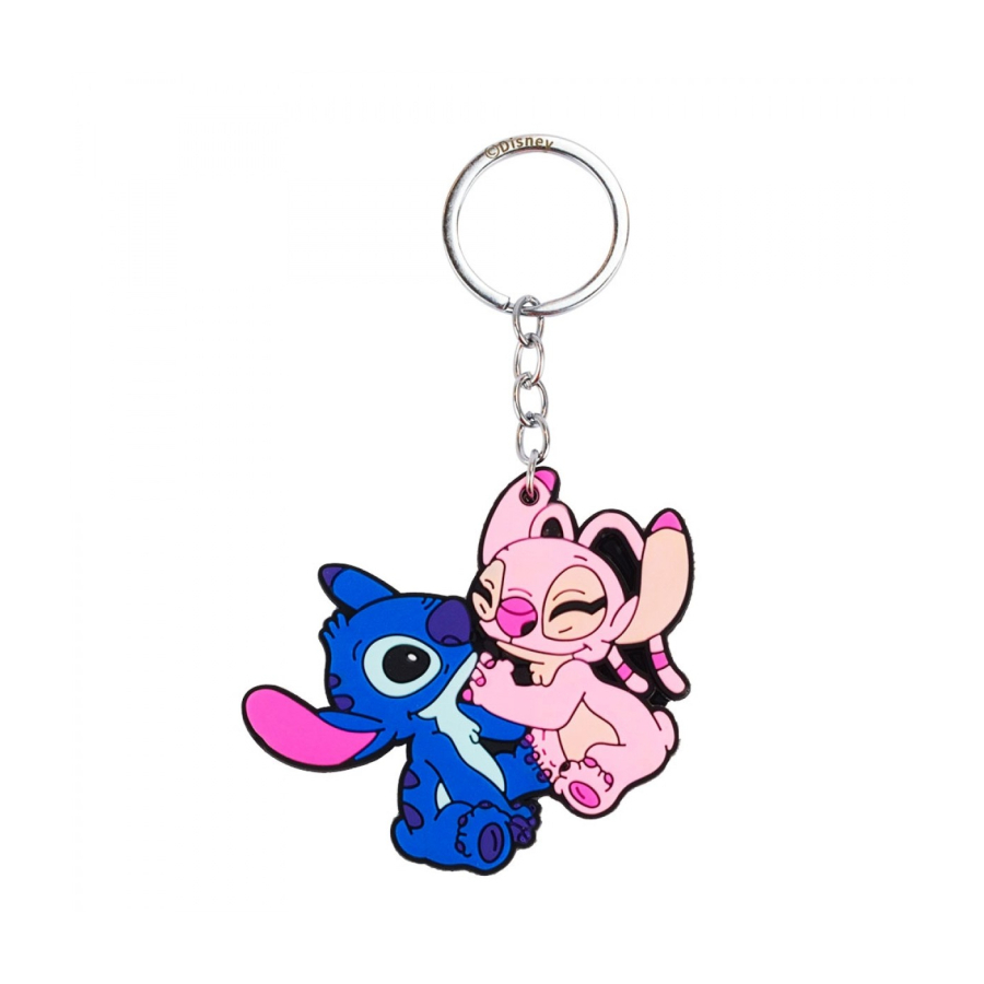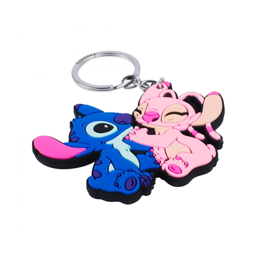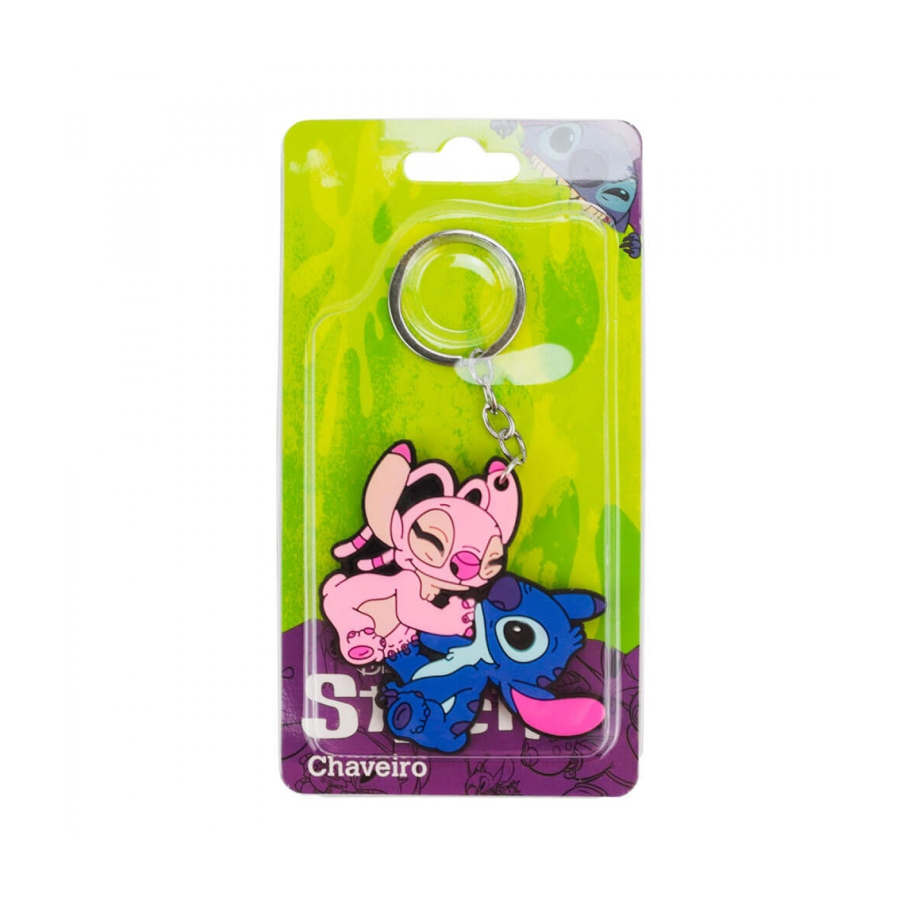 Chaveiro de metal com enfeite no formato do Stitch e Angel de silicone maleável com 7 cm de altura. Material: silicone e metal
