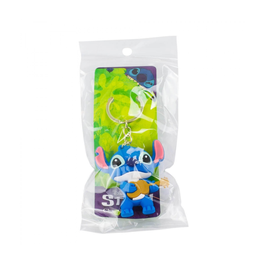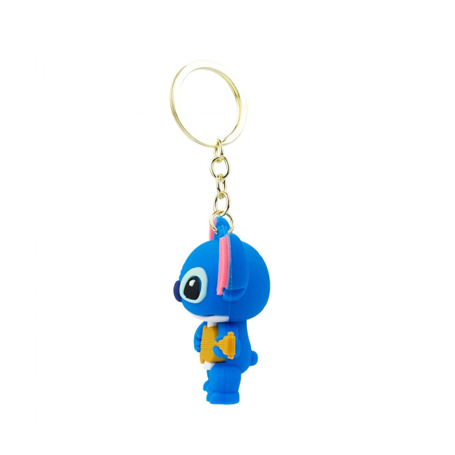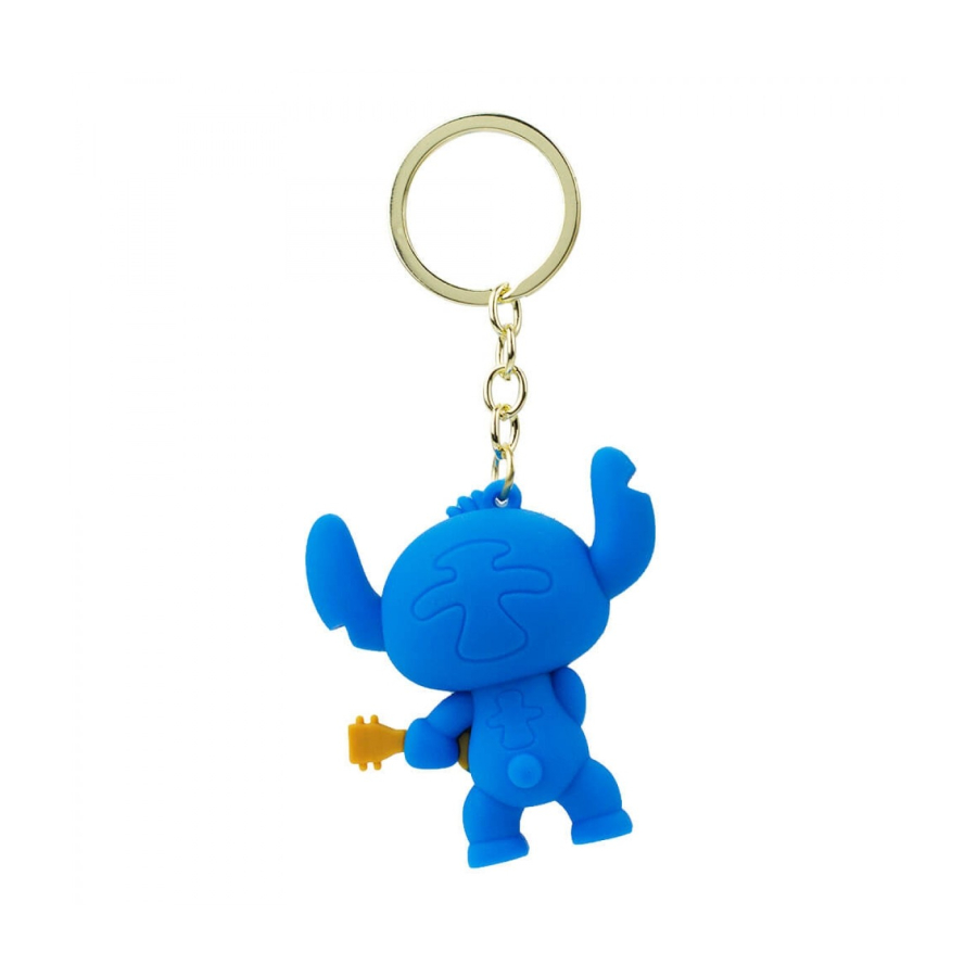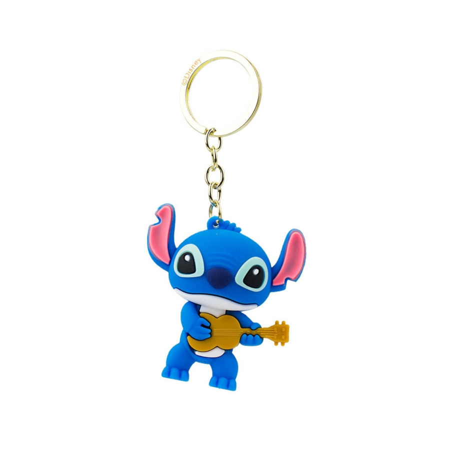 Chaveiro de metal corrente dourada com enfeite no formato do Stitch tocando violão de 6 cm. Material: metal e silicone