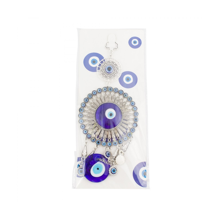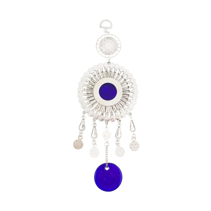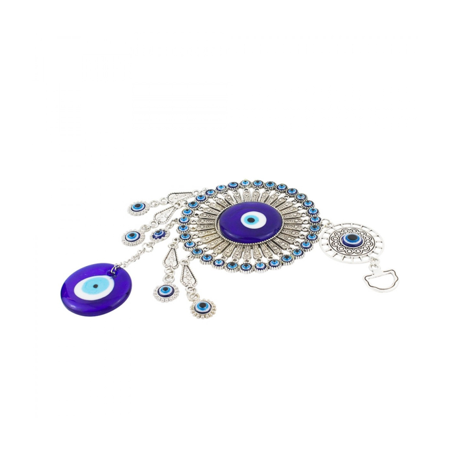 Enfeite para pendurar de 26 cm de comprimento com correntes ligando enfeites no formato de olho grego azul de metal e de vidro. Material: metal e vidro