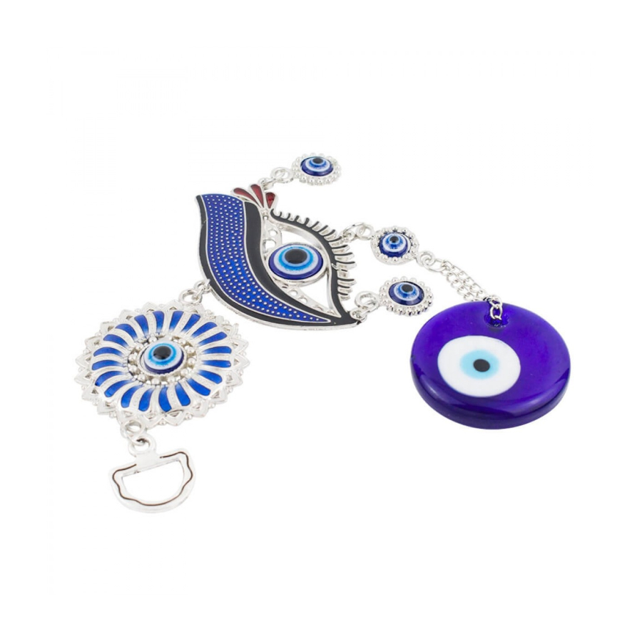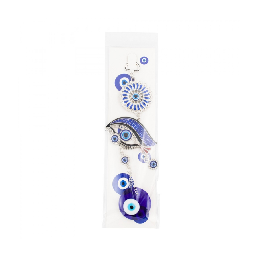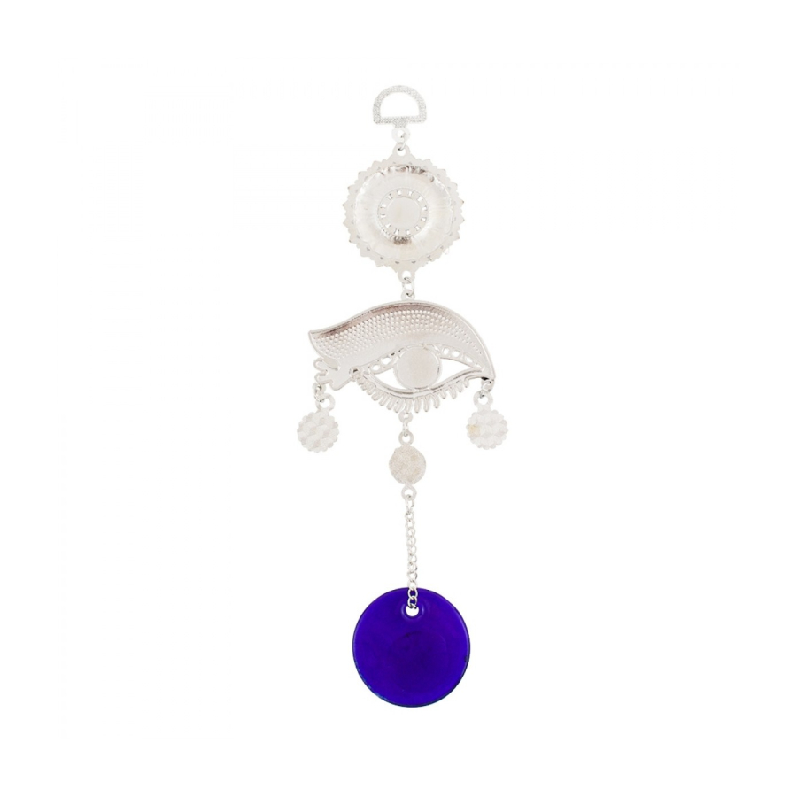Enfeite para pendurar de 22 cm de comprimento com correntes ligando enfeites no formato de olho grego azul de metal e de vidro. Material: metal e vidro