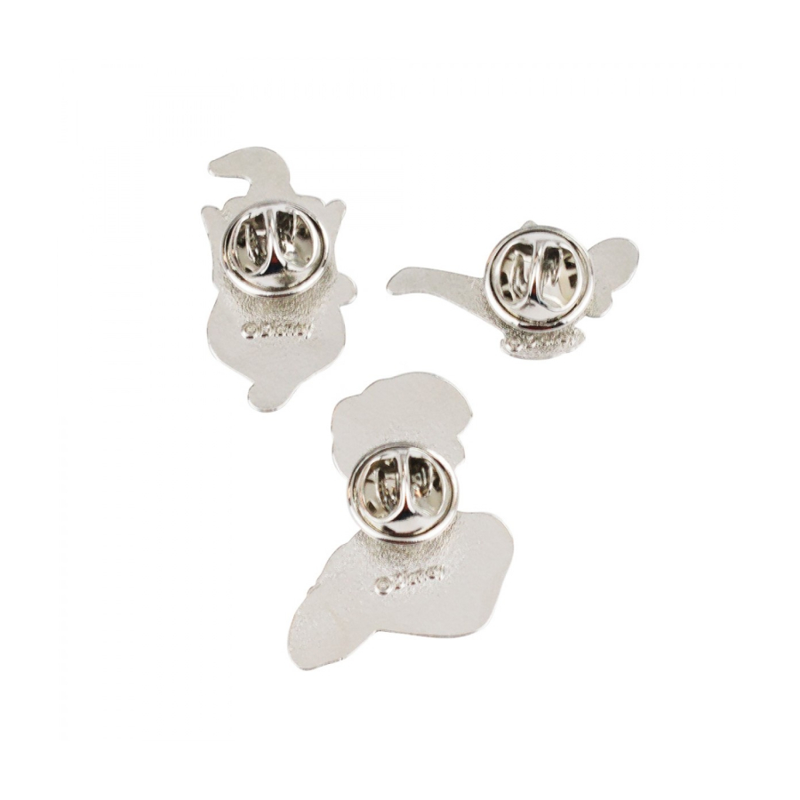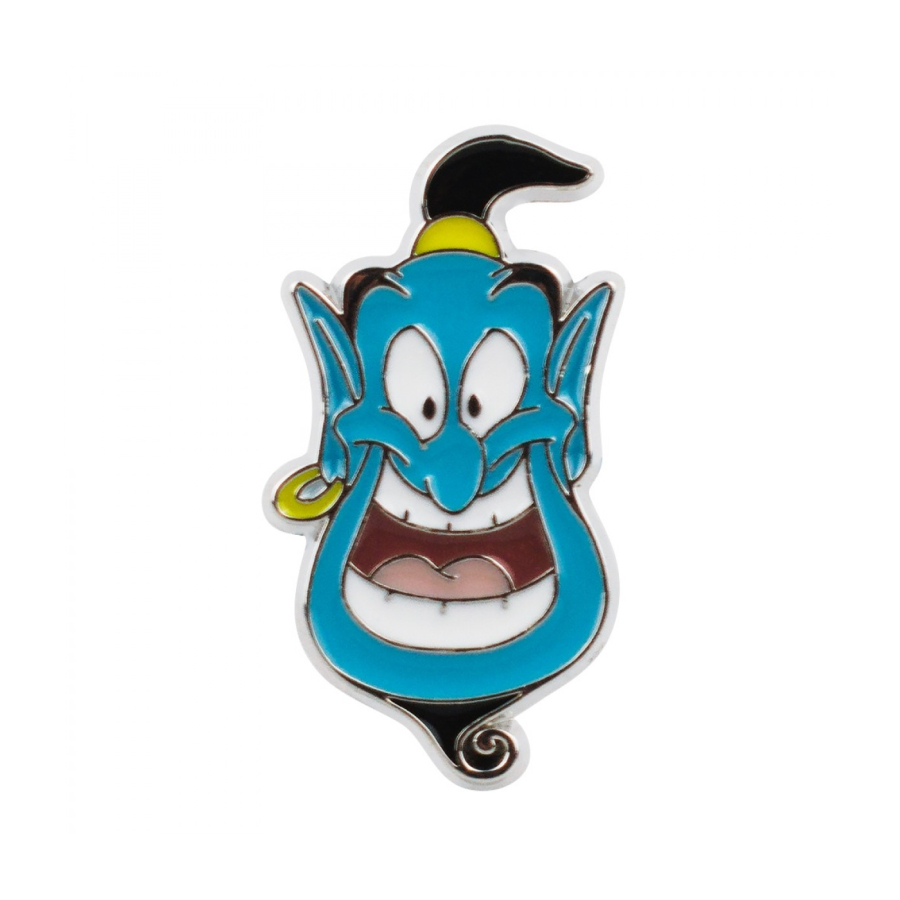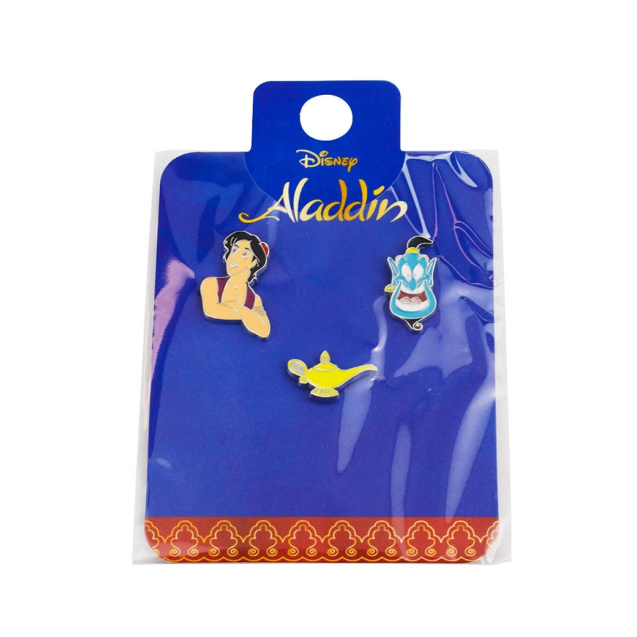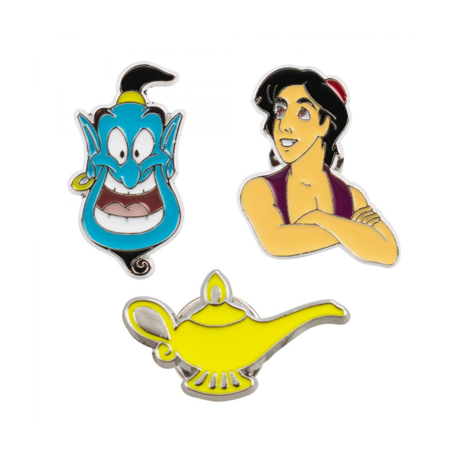 ogo com 3 broches dos personagens do Alladin. Broche do Gênio de 3 x 1,5 cm, broche do Alladin de 3 x 2,5 cm e broche da lâmpada mágica de 1,6 x 2,7 cm todos nas cores do filme da Disney. Material: metal