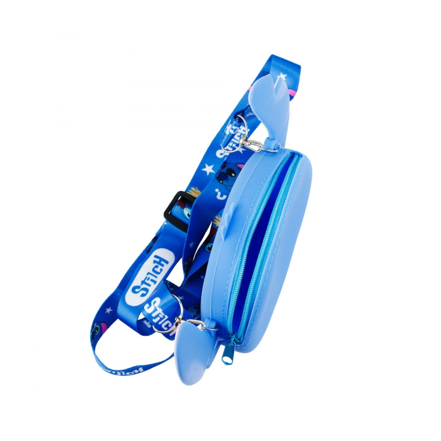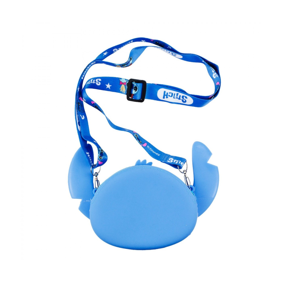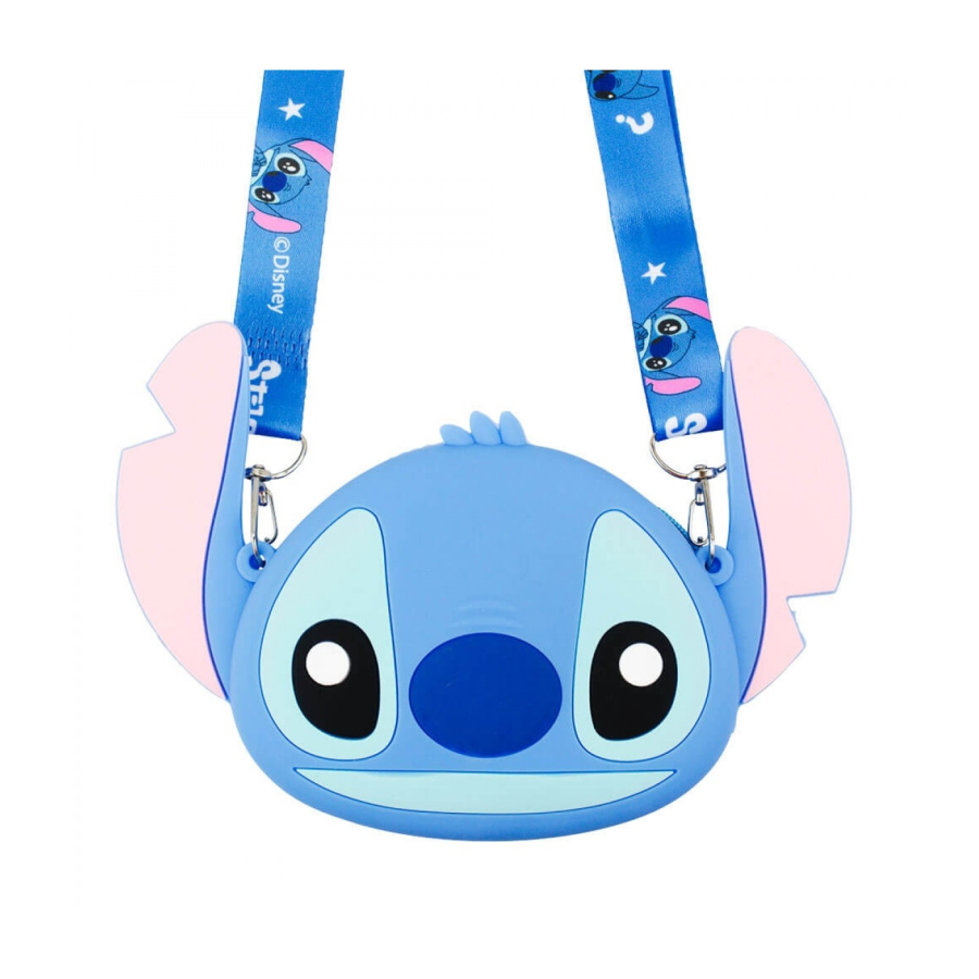 Bolsinha de ombro no formato do rosto de Stitch toda de silicone com 13 x 18 cm de dimensão. Alça de ombro removível. Fechamento a zíper. Material: silicone