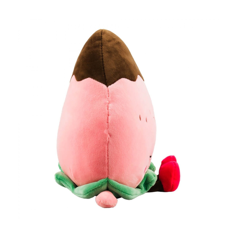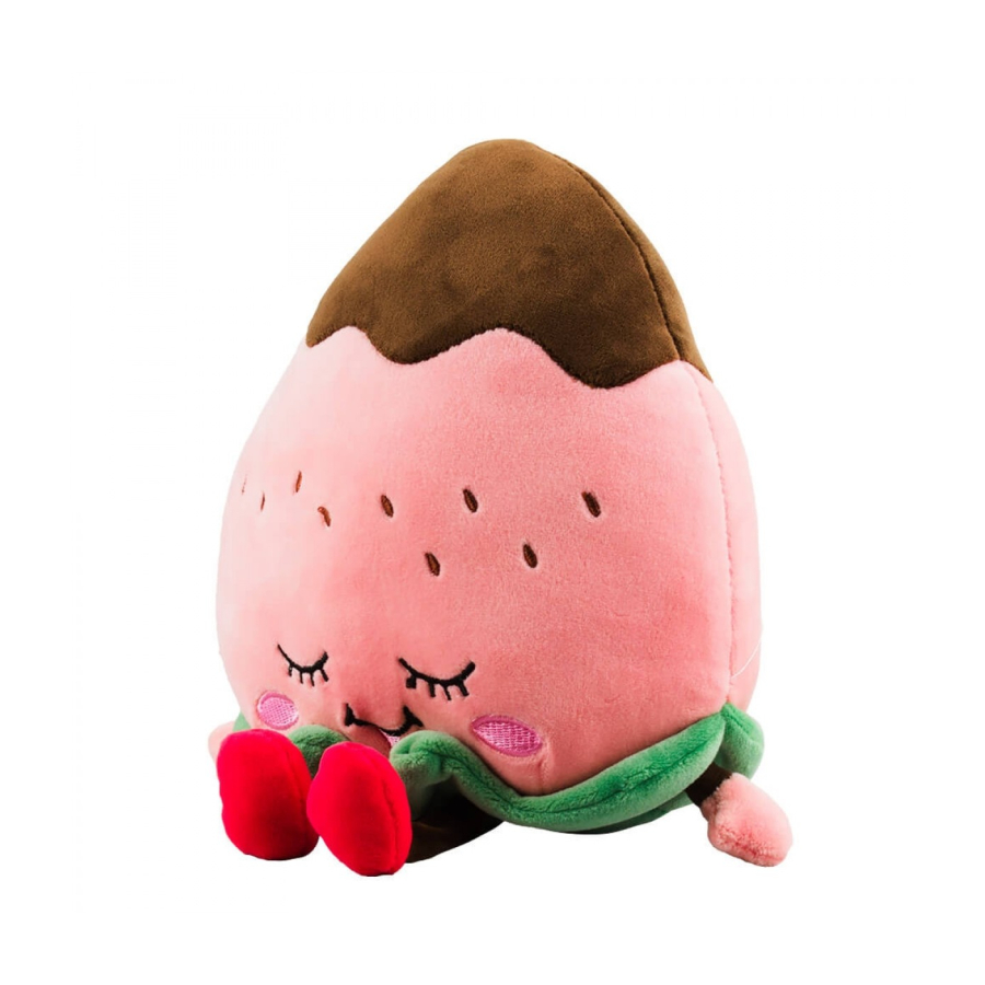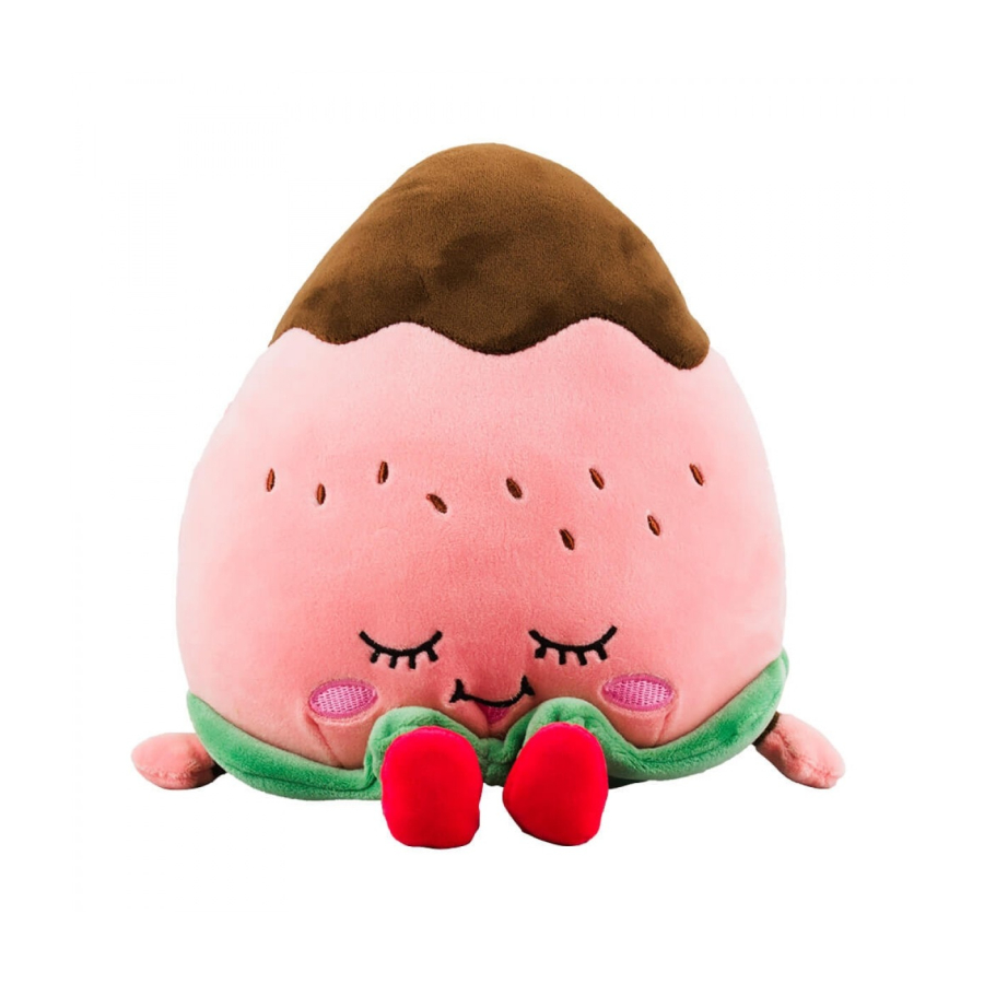 Pelúcia no formato de um morango na cor rosa coberto de chocolate no topo com 20 cm de altura. Moranguinho de pelúcia tem um rosto de olhos fechados e pezinhos soltos. Material: poliéster Enchimento: fibra de poliéster Produto certificado por Órgão acreditado pela CGCRE do INMETRO