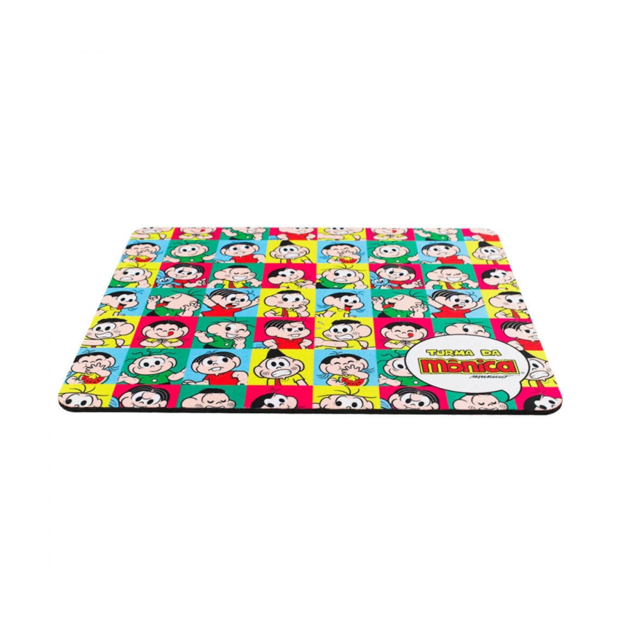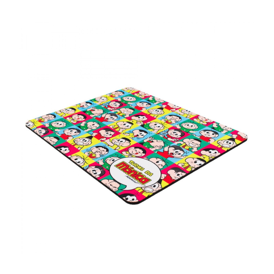 Mousepad com 18 x 21,5 cm de dimensão, estampa com personagens da Turma da Mônica cada um no seu quadriculado. Material: borracha e poliéster